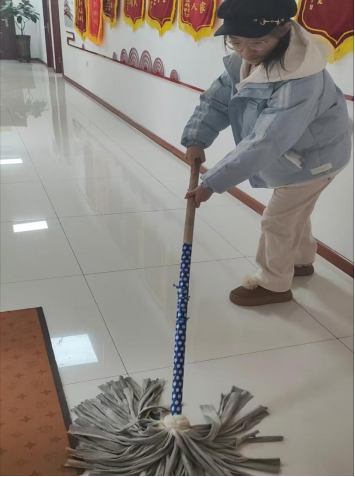 1月30日,工管231班付明琪,满怀热忱响应志愿服务号召,迅速投入到社区志愿服务中,本次服务为卫生打扫活动。付明琪同学挥动着拖把,专注地清洁室内地面。她弯腰俯身,顺着地面纹路用力擦拭每一处污渍,连墙角、桌下等卫生死角都不放过。在她的细致打理下,原本蒙着一层灰尘的地面逐渐变得光亮洁净,墙面悬挂的锦旗在整洁环境的映衬下,愈发鲜艳夺目,她的行为获得了社区和居民的一致肯定,并用实际行动生动诠释了“奉献、友爱、互助、进步”的志愿精神。