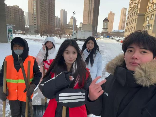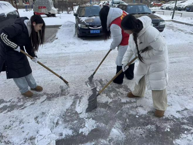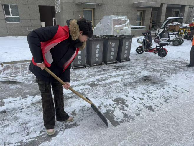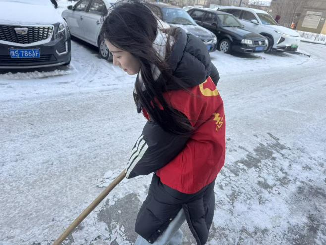1月28日,汤心甜小组的同学们走进社区,开展 “清雪除冰暖人心” 志愿服务活动。
