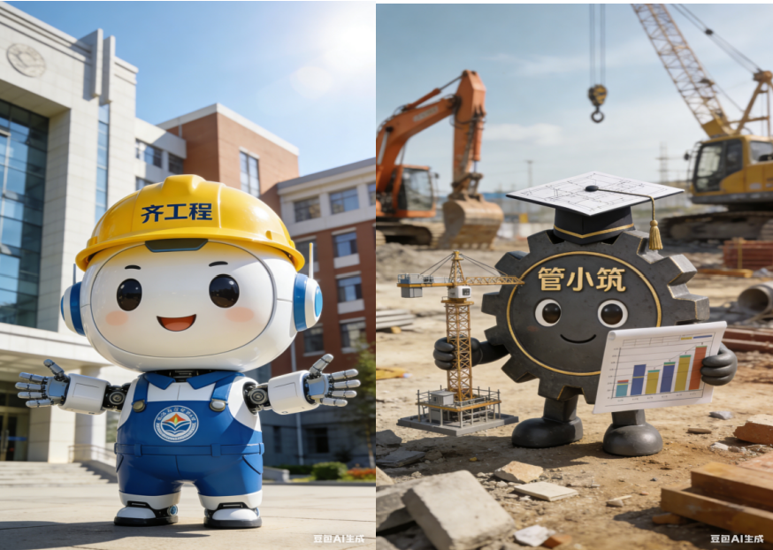 图一为“齐小匠”,形象是圆滚滚的拟人化“智能建筑机器人”,头戴印有“齐工程”字样的黄色安全帽,身穿蓝白配色的工装服,胸口印有校徽。安全帽:代表工程类专业的安全与责任。机械手臂:象征动手实践与智能制造能力。名字“齐小匠”既呼应“齐齐哈尔”,又以“匠”字彰显学校“工匠精神”的育人理念,吉祥物可作为校园文化活动、招生宣传的视觉符号。