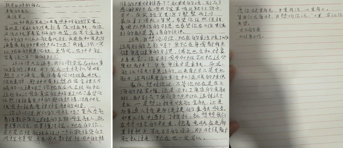 江西的寒假带着温润的凉意,互金231班曹达强寻得一隅静谧,郑重地展开信纸,提笔写下致毕业的自己的一封信。