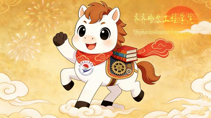 这只憨态可掬的白色小马,身披祥云纹样的红围巾,胸前印有齐齐哈尔工程学院的校徽,背上的齿轮鞍具与堆叠的书籍,精准呼应了学校“工程+教育”的办学定位。暖金色的背景上,祥云舒展、烟花绽放,既营造出浓浓的新春氛围,也传递着温暖喜庆的节日祝。