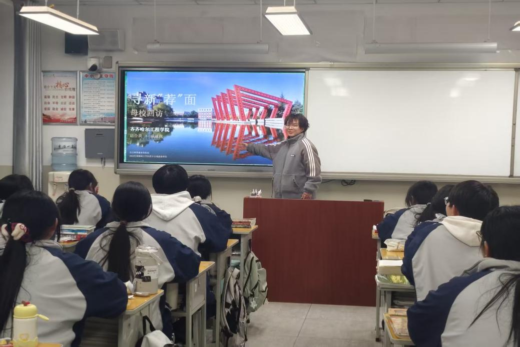2026年2月4日,土木与管理学院互金241班陈浩泽重返高中母校,开展了一场“重回母校,薪火相传”主题活动。向学弟学妹们分享大学成长经验,展示齐齐哈尔工程学院“务实进取”的育人氛围与特色。