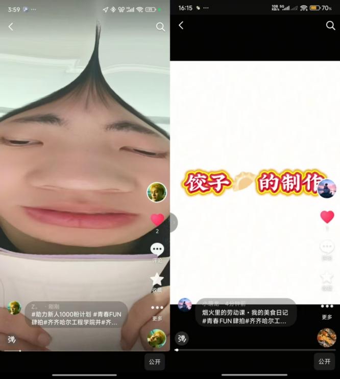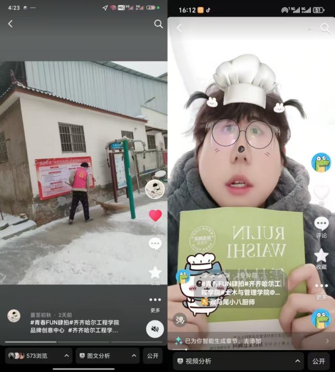 四个短视频以假期生活为背景,各有侧重,记录生活片段、传递正向价值:《烟火里的劳动课・我的美食日记》聚焦美食制作,展现劳动乐趣与烟火气;《社会志愿行一一企业调研、公益服务等》定格农村志愿扫雪画面,传递公益温情与协作力量;两条《书香伴假期·1分钟好书速推》视频分别解读《儒林外史》古典讽刺内核与《设计中的设计》设计思维和生活美学,实现知识与灵感的快速传递。
