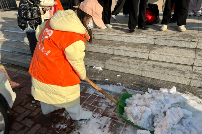 1月15日,吉林白城迎来了一场降雪,前胜小区因降雪导致道路积雪结冰,小区迅速发起“清雪保畅,情暖大家”志愿活动,财管233班兰蕊作为青年志愿者积极响应。