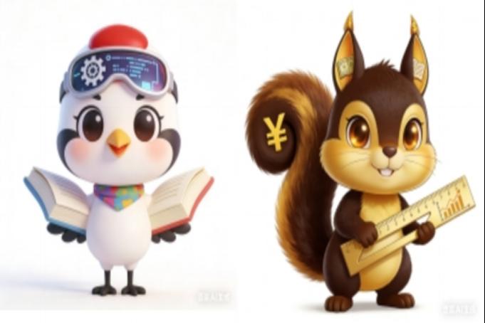在阅读相关设计类书籍后,孟婧雯结合地域特色、校园文化与专业特点,设计出学校吉祥物“易易”与财务管理专业吉祥物“粟灵”。“易易”以丹顶鹤为原型,融合亮剑精神、工匠文化;“粟灵”以东北松鼠为原型,紧扣财务专业与工科交叉特色,尽显学子巧思与专业风采。