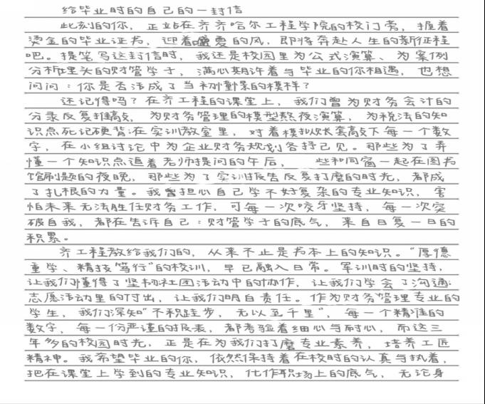 孟婧雯写给未来的信中回顾了在校期间的专业学习、实践经历及校训精神对品格的塑造,并基于财管专业特点,对未来的职业素养、持续学习、人际感恩及生活平衡提出了具体期许。