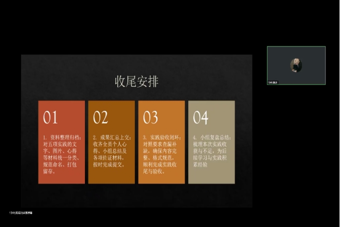 随后,会议抽取实践小组依次汇报当前实践进度、阶段性成果及收尾工作详细计划。学生代表财管233班祁晓丽结合自身实践经验,从流程规范、成果提炼角度提出优化建议;生涯导师代表朱欣欣则聚焦目标闭环与细节完善,针对性给出专业指导,助力各组高效推进收尾工作。