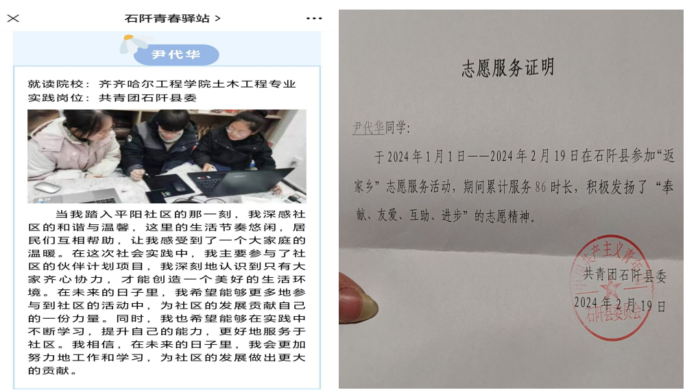 尹代华表示,通过这项社会实践活动,深刻认识到,齐齐哈尔工程学院的社会实践任务对大学生的成长有着重要的作用。作为一名大学生,应该积极参加社会实践活动,了解社会,锻炼自己,为社会做出自己的贡献!