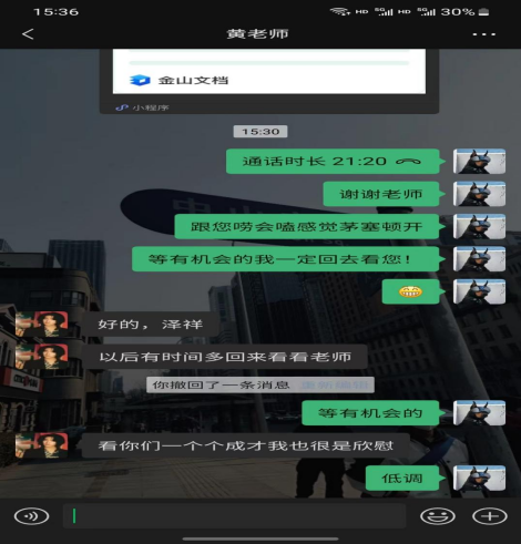 通过本次线上回访让王泽祥同学深刻认识到了高中时期老师的严厉是为大家好,王泽祥同学表示“老师高中时期对我非常严厉,高中时期我并不喜欢黄老师,但是通过本次回访看到了老师和蔼的一面,以后有机会他一定会常回到母校看老师。”