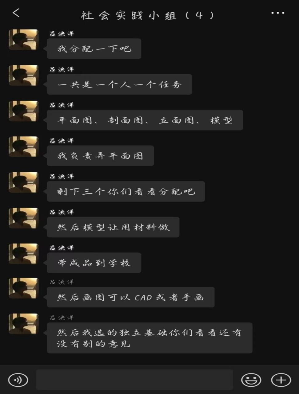 小组组长吕泱洋进行了该项目的任务分配,小组其他成员都选择了自己负责的任务,小组组长吕泱洋负责独立基础平面图的绘制,小组成员路昊远负责独立基础的剖面图绘制,小组成员崔金梦负责独立基础的立面图绘制,小组成员王宇佳负责独立基础的模型制作。