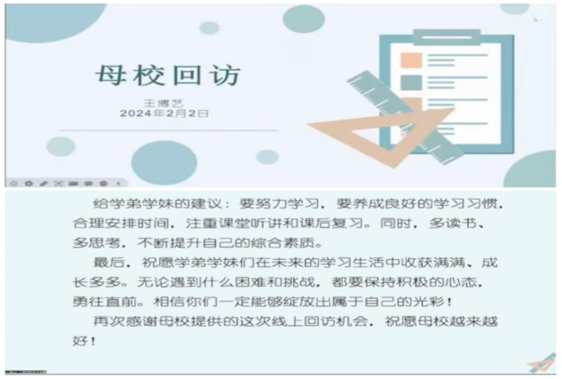 这次线上回访让我们深切地体会到,即使身处异地,我们的心仍然与母校紧密相连。让我们深刻认识到自己在母校的学习经历对自己成长的重要影响。母校不仅教会了我们知识,更培养了我们独立思考、勇于创新的精神。我们期待未来有机会再次回到母校,亲身感受那里的变化和进步。同时,我们也将继续关注和支持母校的发展,为母校的未来贡献自己的力量。