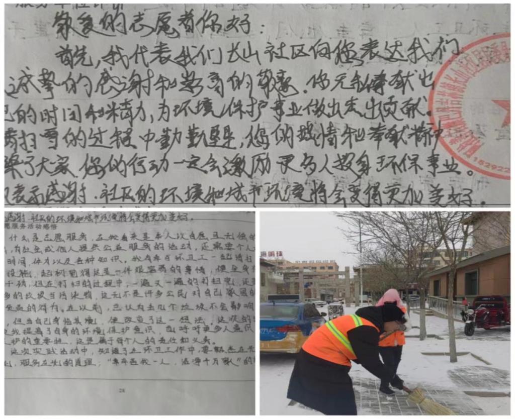 什么是志愿服务?魏鑫鑫认为是在本人自愿且无偿的基础上,为社会或他人提供公益服务的活动,需要个人贡献出时间,体力以及各种各样的知识。志愿服务的类型有很多,魏鑫鑫选择环境保护这一项,有幸在2月16号到2月19号这四天的时间里,到阿拉善盟阿拉善右旗长山社区里一同与环卫工进行了打扫街道的任务。