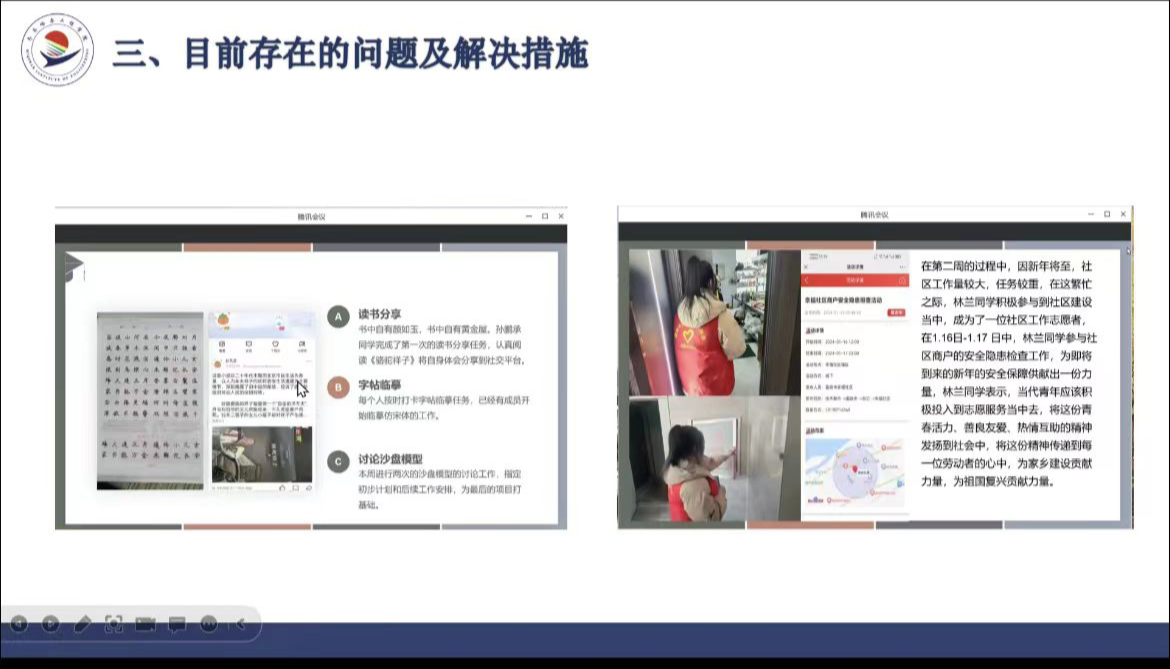 会议中,各组选派一名学生进行汇报,学生对社会实践学期的进度、读书分享、居家劳动、母校回访、志愿活动等内容存在的不足进行总结汇报,各小组代表踊跃发言,先后回顾总结了六周社会实践的成果,并分享了接下来项目实施的活动计划,在汇报过程中,宋老师老师多次给予同学们鼓励和建议。