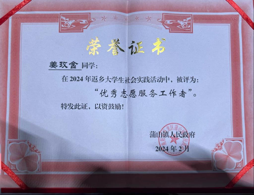 姜玫含同学通过这个寒假的社会实践,还被家乡当地政府授予“优秀志愿服务工作者”的称号。