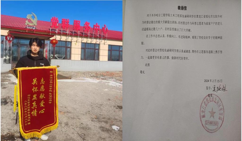 张涵硕同学对乡镇老人慰问志愿活动,给村民一个更温暖,更有爱的社区环境。通过上门慰问,让一些独居老人体会到来自社会的温暖。同时,这一活动也让其更加了解乡镇的生活和关系状况,增进了对乡村的热爱和尊重。在这次志愿服务中表现非常优秀,获得到了乡镇居民们的一致好评,特此发给张涵硕同学锦旗特此表扬。参与乡镇的慰问志愿活动,不仅具有社会意义,更是一次难得的社会实践和成长机会。这样的活动应该得到更多的关注和支持,让更多的人参与到环保事业中来,共同守护我们的美丽家园。