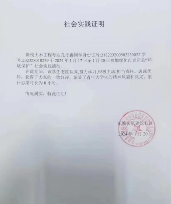 土木232孔令鑫:孔令鑫同学在社会实践期间进行了环境保护志愿活动,环境保护志愿活动不仅对环境有着正面影响,同时也对个人成长有着重要的意义。参与环境保护志愿活动可以锻炼其的组织能力、团队合作能力和领导能力,培养其解决问题的能力和创新精神。在环保志愿活动中,还能够增强责任感和使命感,感受到环保工作的意义和价值,从而提升个人的社会责任感和使命感,成为更多有担当、有情怀的社会新青年。