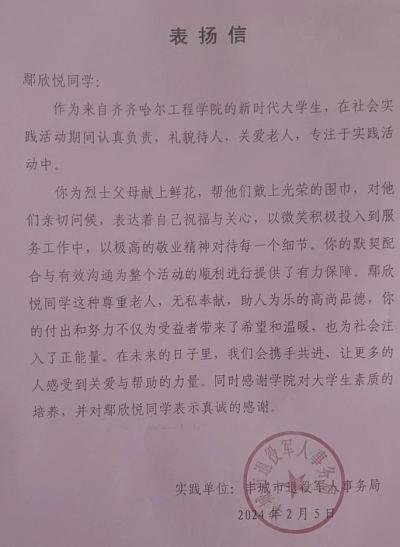土木232鄢欣悦:鄢欣悦同学对烈士父母进行了看望,为他们戴上光荣的围巾,并进行了亲切问候。对烈士父母进行看望问候的志愿活动,不仅是对烈士精神的传承和尊重,更是对烈士家庭的一种深情关怀。这样的活动,让烈士父母感受到社会的温暖和关爱,减轻了他们的孤独和悲伤。同时,对于她来说,这也是一次深刻的教育和洗礼。他们通过亲身参与,更加深刻地理解了烈士的英勇和牺牲精神,增强了爱国情感和社会责任感。这样的活动不仅有助于培养大学生的公民意识和社会责任感,还能促进社会的和谐与稳定。总之,看望问候烈士父母的志愿活动,不仅是对烈士精神的传承和弘扬,更是对烈士家庭的实际帮助和关怀,同时也是大学生自我教育和成长的重要途径。