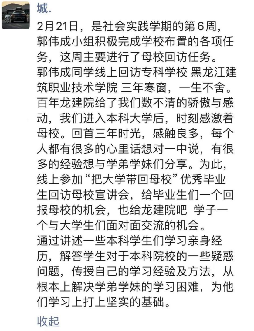 郭伟成同学线上回访专科学校黑龙江建筑职业技术学院三年寒窗,一生不舍。百年龙建院给了我们数不清的骄傲与感动,我们进入本科大学后,时刻感激着母校。回首三年时光,感触良多,每个人都有很多的心里话想对一中说,有很多的经验想与学弟学妹们分享。为此,线上参加“把大学带回母校”优秀毕业生回访母校宣讲会,给毕业生们一个回报母校的机会,也给龙建院吧 学子一个与大学生们面对面交流的机会。
