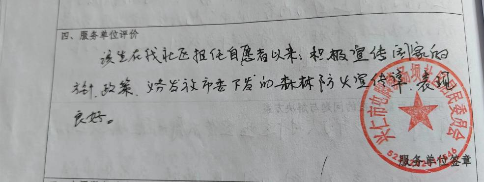 近日,陈显佑同学的家乡贵州省山火频繁。为增强人们的防火安全意识,他来到贵州省兴仁市屯脚镇场坝社区居民委员会做志愿者,主要是宣传防火安全及火灾的严重性,发放宣传单到人民群众手中并普及防火安全知识。