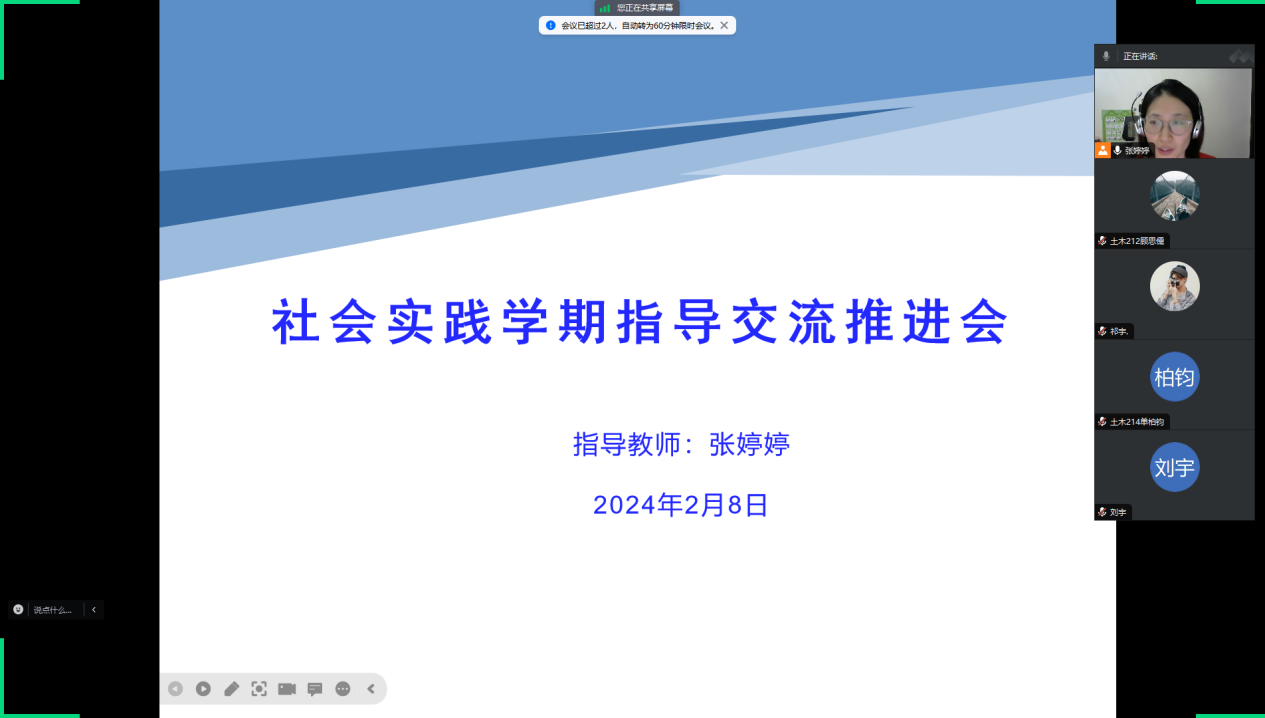 2月8日,生涯导师张婷婷通过线上会议的形式开展社会实践学期第四周指导交流推进会,共18名学生参加。首先,张老师对同学们社会实践学期任务完成情况进行公示,总结四周任务整体情况,针对表现突出同学予以表扬,对任务完成进度较慢同学,提出合理化建议。其次,张老师强调假期安全问题,告诫同学们假期欢愉的同时,要注意自身安全和财产安全,做到饮酒有度,谨记喝酒不开车,开车不喝酒,自觉遵守交通法规。然后,针对同学们期末考试成绩整体情况作以提醒和指导,建议同学们利用假期查缺补漏,提前做好复习补考准备。最后,张老师向同学们送去新春祝福,祝同学们新的一年里,身体健康,阖家欢乐,学业进步,心想事成!