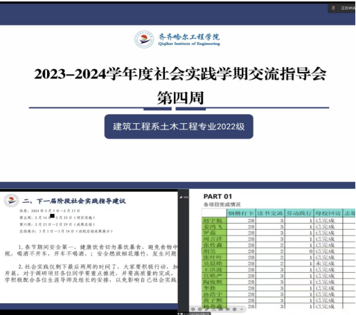 为了解各位同学在社会实践学期第四周的任务完成情况,推进社会实践学期各项工作。2024年2月6日13时,辅导员刘子豪老师在腾讯会议上组织开展社会实践学期第四周指导交流会。