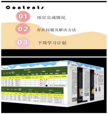 会议开始刘老师让各组长以ppt的形式汇报各组社会实践学期各项目开展情况,本周在执行过程中出现的问题,解决方法和下一阶段的项目开展计划。