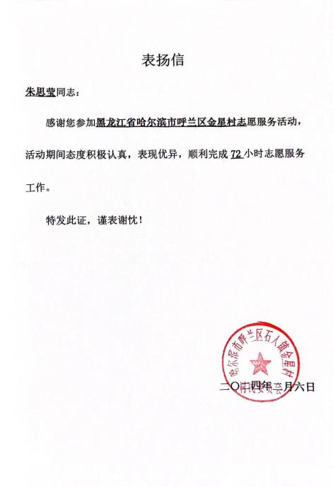 社会实践学期使我们受益匪浅,这种志愿经历不仅能够帮助我们提升沟通和协作的能力,也能让我们从中学到如何关爱他人,并在实践中感悟人生的价值。此次敬老救助志愿服务活动,朱思莹同学获得村委会同志的广泛好评,并赠予锦旗与表扬信。