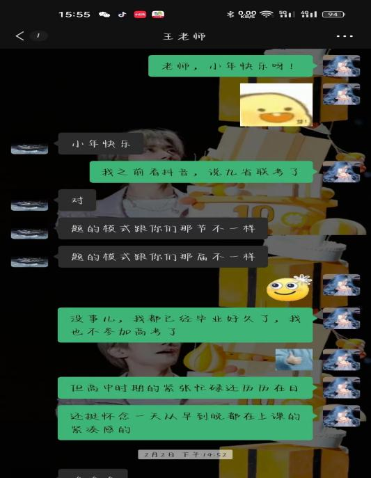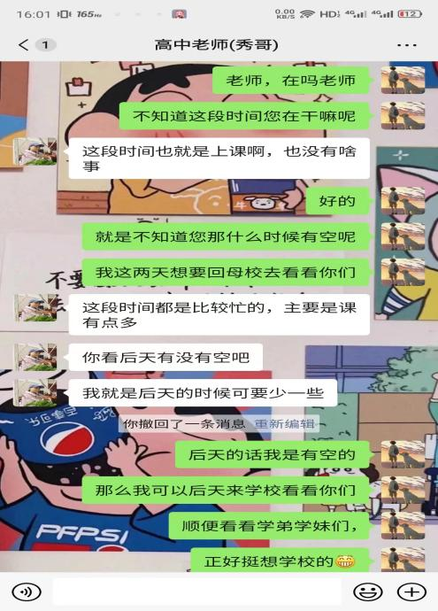 郭洪涛同学和高中老师一起在高中校园里漫步,和老师聊以前的高中生活,没想到老师依旧记得;他还和老师聊了他现在的大学生活,聊了对未来工作的憧憬。赵讯同学去老师的任教班级做旁听生,重温了熟悉的高中课堂,并且和学弟学妹们分享了自己丰富的大学生活。李欣怡同学和陈旭同学进行的是线上回访,和老师共同回忆了高中的趣事,聊起了现在大学的生活,他们给学弟学妹们提出了一些学习建议,并提醒高考临近让学弟学妹们保持心态。