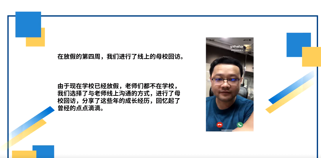 会议刚开始,张晶晶老师让各组的小组以PPT的形式进行社会实践学期阶段性的汇报,其余小组进行点评和总结。在经过各小组的汇报和总结,四周的社会实践学期让每位同学都有所收获。同时,也反映出各小组存在的问题,有的小组任务进程过慢,有的小组对待任务还有懈怠。这次的总结是为了让各小组及时发现自己的问题并做出改正,以确保各组能及时地有质量地完成社会实践学期的任务,并从中有所收获有所成就。在会议最后,张晶晶老师也重点强调了过年安全问题,提醒学生们在过年期间也要注意好自身的安全问题,做到平平安安过年。也祝愿每一名同学新的一年能有新的收获。