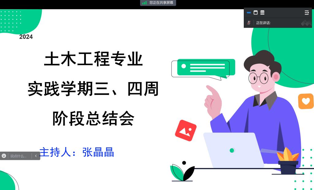 为了增强学生们的社会责任感,更好地服务社会,土木工程专业于2月2日组织线上第三、四周阶段总结会议,会议由土木工程专业教师张晶晶主持,社会实践学期各小组长参加,本次会议的主要形式就是通过小组长汇报来了解学生们的社会实践完成情况。