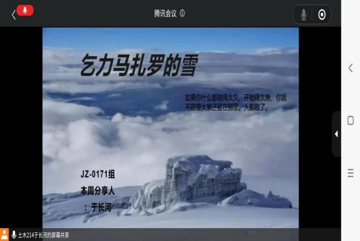 小组成员进行读书分享,本周分享的图书是由美国作家海明威创作的中篇小说《乞力马扎罗的雪》对生命意义的苦苦探索,对专业学习更加有干劲与努力的决心。