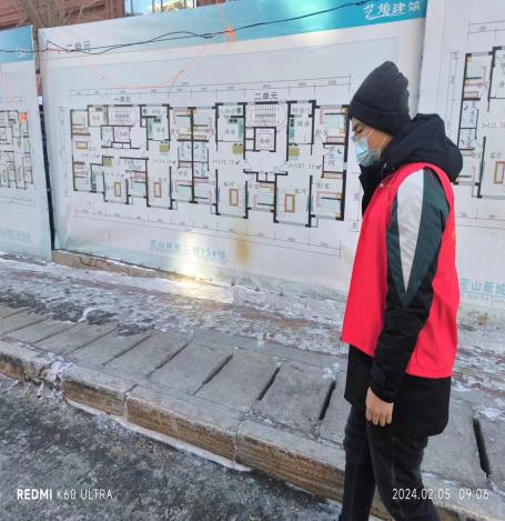 2024年2月5日,于长河在黑龙江省鸡西市密山市莲花社区进行志愿活动,在街区巡逻,防止市民在闹市区烧纸,保证文明春节,文明祭祀。