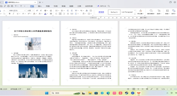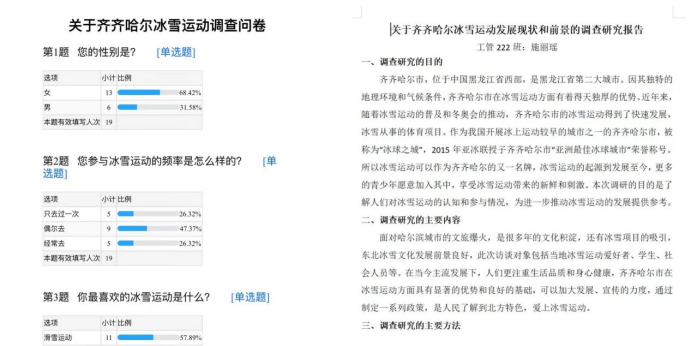 调查问卷:小组成员施丽瑶制作了冰雪大世界调研报告。调查问卷能提供客观而准确的数据。调查问卷的一个重要优点是它能够提供客观和准确的数据。通过科学的调研方法,调研人员可以获取到真实的情况和事实,减少主观因素的干扰。这些数据能够帮助决策者全面了解问题的本质和规模,从而做出更为明智的决策。具体的数据和数据分析可以使报告更具可信度和说服力,使决策者更有信心。