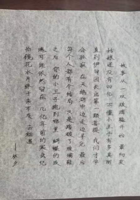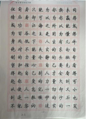 钢楷临摹:小组成员施丽瑶和隋环宇完成了本周的钢楷临摹。练习书法能使人心平气和,心旷神怡、从容自若。同时,书法可以让人们看到美。书法是艺术,艺术是美的体现。字体结构中到处是美或善的表现。写字可以修身养性,当心情烦乱时,写一写汉字,可以使燥乱的心情平静下来。