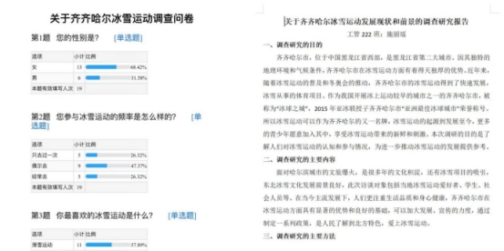 施丽瑶、张紫嫣进行了“齐齐哈尔冰雪大世界和冰雪运动调研报告”工作。主要目的是响应哈尔滨的活动,调查依据各自家乡的情况开展此类活动的优弊,希望能够提供客观和准确的数据,为振兴齐齐哈尔出谋划策。通过调研,施丽瑶同学认识到,只有通过科学的调研方法,才能获取到真实的情况和事实,减少主观因素的干扰。这些数据能够帮助决策者全面了解问题的本质和规模,从而做出更为明智、准确、理性的决策。