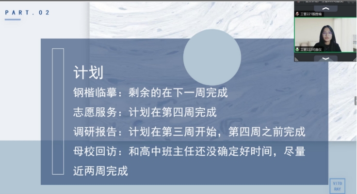 王梓玮介绍了新增助教的点评环节,从项目进度情况、内容连贯性以及汇报整体思路等进行点评。并提到了助教点评环节的增设,助教们能够更深入地了解同学们的社会实践项目进度,为同学们提供帮助以及更好地跟老师对接任务。