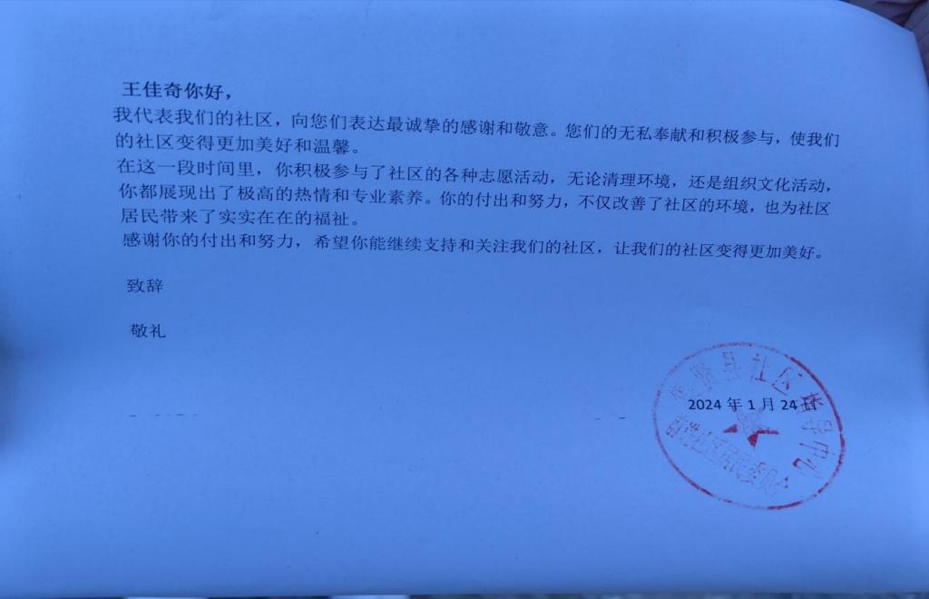 在本周的社会实践中,小组成员积极完成每日任务,并参与到社区服务,如帮助社区进行值班、打扫屋地等志愿服务活动,大家在志愿活动方面进行了积极的交流。2024年1月24日小组成员王佳奇参加黑龙江省双山市集贤县前进社区志愿服务中,认真完成社区分配的任务,积极主动的积极参加各种社区活动,社区特此写了感谢信。