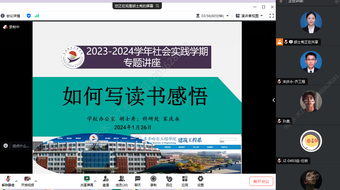 为加强对社会实践团队和小组的有效指导,提升社会实践学期“读书交流项目作业”的质量,1月26日晚,生涯导师胡士秀、宋庆永面向所负责的社会实践学期12个小组的学生在线举办专题讲座——《如何写读书感悟》。