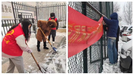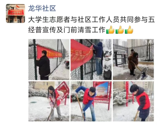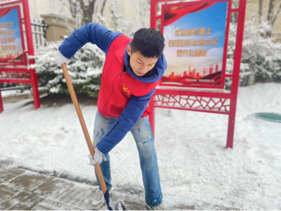 当天泊头市区突降暴雪,对所在龙华社区居民出行造成不便。唐剑扬同学与龙华社区志愿者组成“龙华社区除雪先锋队”,开展龙华社区道路积雪清扫工作,清扫龙华社区主干道路,方便龙华社区居民出行。