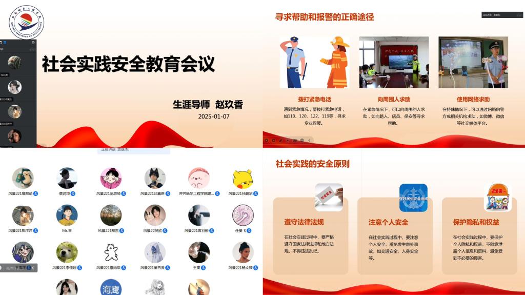 会议伊始,赵玖香老师通过的 PPT的形式,向同学们展现了社会实践过程中可能面临的各类安全风险,从交通意外、人身伤害到突发自然灾害等,让同学们深刻意识到安全保障的重要性。遇到困难或突发情况,要第一时间通过当地的求助热线、政府部门公开电话等正确渠道寻求帮助,切不可慌乱行事。