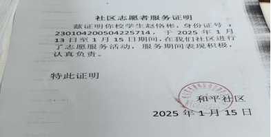 1月15日,财管232赵恪彬来到和平社区,顺利开展志愿活动。