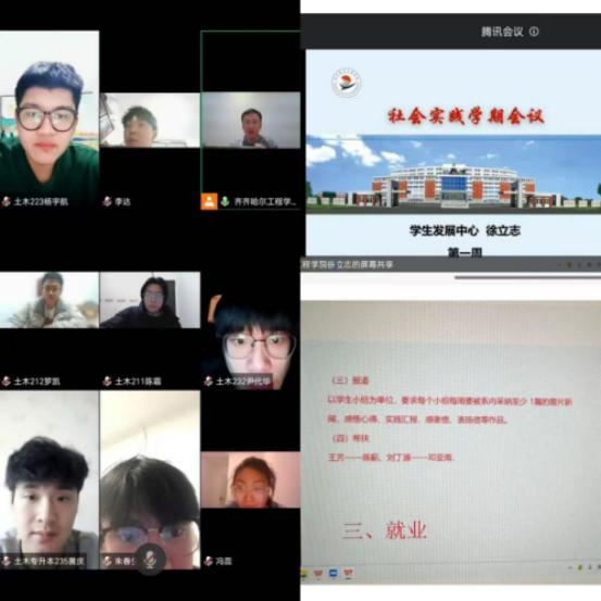 生涯老师徐立志在开腾讯线上召开会议,内容:一、假期注意安全:外出安全,用电安全,用火安全,交通安全,燃火安全,饮食与网络安全。二、学习:1.学校安排的社会实践学期各项内容必须保质保量按时完成。2.分别梳理了个人作业和团队作业,告诉大家各项活动要留痕,要拍照,有报道。3.建立一对一帮扶小组,为每位新生配备了负责的生涯学生作为学长,指导新生更好的完成社会实践学期任务。三、就业:普本大四与专升本大五学生利用假期时间抓紧落实就业单位,其他非毕业年级在社会实践学期也要关注就业情况。