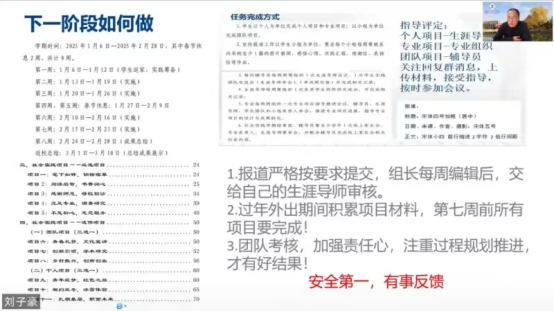 辅导员刘子豪从当前阶段存在问题与下一阶段如何去做进行总结,刘老师强调到,社会实践学期要充分引起重视,小组长要充分发挥作用,做好协调推进工作,要带领团队高质量完成每项任务。安全问题是任何活动开展的前提,希望全体同学在享受节日美好的同时,时刻注意出行、人身、财产安全,确保平安实践。