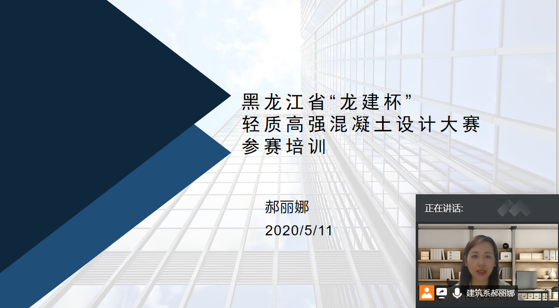 5月11日,土木工程专业通过腾讯会议,举办了黑龙江省“龙建杯”第九届轻质高强混凝土设计大赛备赛线上指导。本次培训由参赛指导教师郝丽娜主持,指导教师徐明,参赛学生王文江,杨子鑫,赵晨,马晓宁参加。