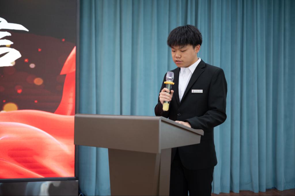 随后,工管231班汪正同学作为学生代表上台发言,表达了对学校、老师的感谢以及对获奖同学的祝贺。汪正同学说:“这份荣誉既是这次比赛的终点,更是新征程的起点。此次获奖提醒着我们过往的努力得到了认可,也激励着我们在未来的道路上继续奋勇前行。”