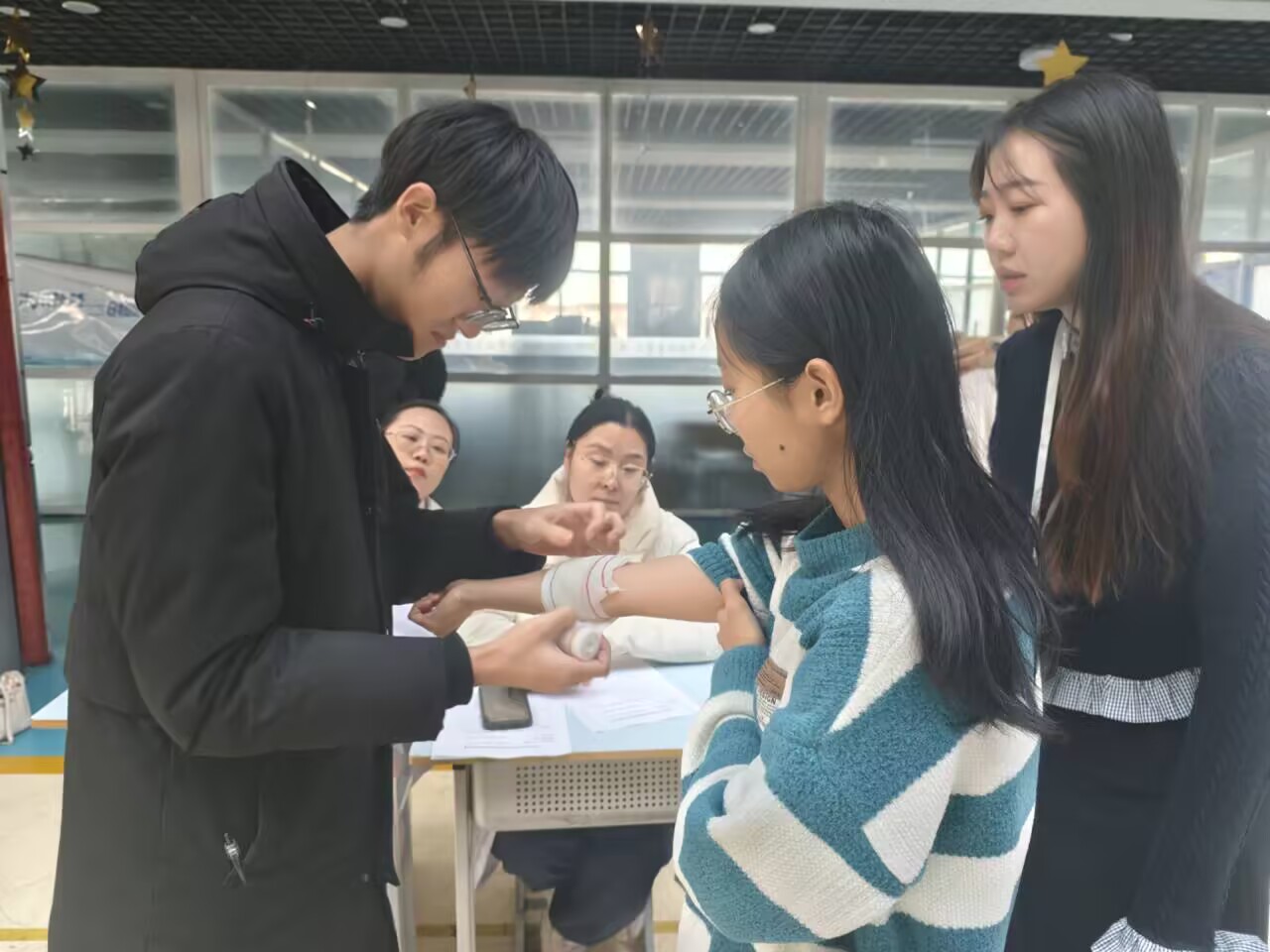 急救包扎环节同样精彩,通过展示不同伤口的包扎技巧,师生们学会了如何使用绷带、三角巾等进行止血和包扎。大家两两一组,相互学习、反复练习,力求熟练掌握。
