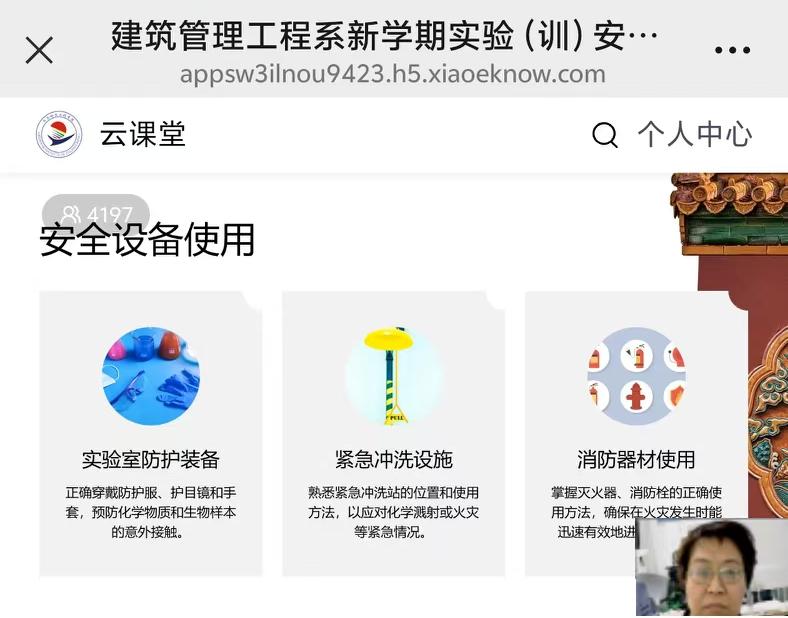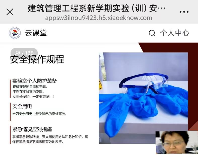 随后,李智慧老师详细讲解了实验(训)安全知识。内容涵盖各实验室安全操作规程,应急预案演练,安全设备使用,防护措施讲解等。具体包括实验室消防设施的正确使用与维护方法、消防通道保持畅通的重要性,以及易燃易爆物品在建筑实验环境中的规范管理等;火灾报警系统的安装位置、使用方式、日常维护和定期检查要点;各类灭火器的适用范围、操作方法及维护保养注意事项;应急疏散方面,明确了火灾发生时的疏散路线、逃生技巧以及紧急集合点的位置;还介绍了如心肺复苏、止血包扎等急救知识,让学生们在面对突发状况时能采取正确的应对措施。