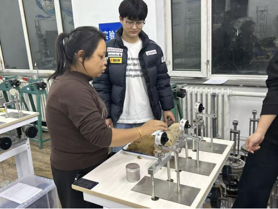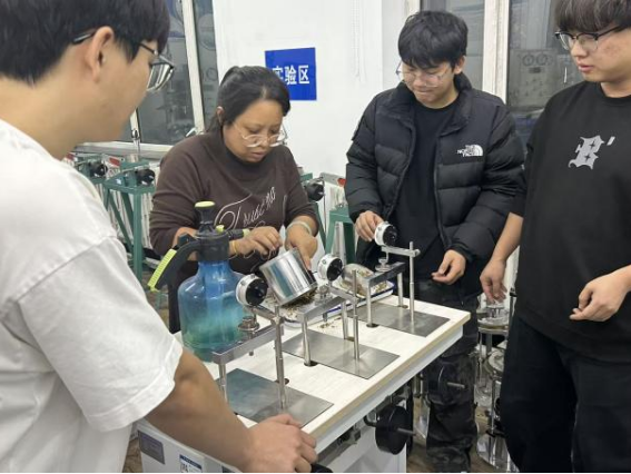 实验中心主任李盼盼,通过现场示范,系统讲解实验原理、仪器操作规范、安全注意事项及数据处理方法,为学生实操筑牢理论基础;同学们细致完成单杠杆固结仪、测微表、环刀等器材的清点调试,备足原状土样、滤纸、凡士林等耗材,确保实验顺利开展。实验现场,同学们分组协作,严格遵循“切取土样→测定初始参数→安装固结仪→加载观测→卸载整理→数据整理”的规范流程推进操作。从土样的精准制备到仪器的规范组装,从分级荷载的平稳施加到测微表读数的精准记录,各小组成员默契配合、严谨操作,充分展现了扎实的专业素养。实验过程中,指导教师全程巡回指导,及时纠正不规范操作,耐心解答学生在数据观测、仪器使用中遇到的技术疑问,保障实验数据的准确性与实验过程的安全性。