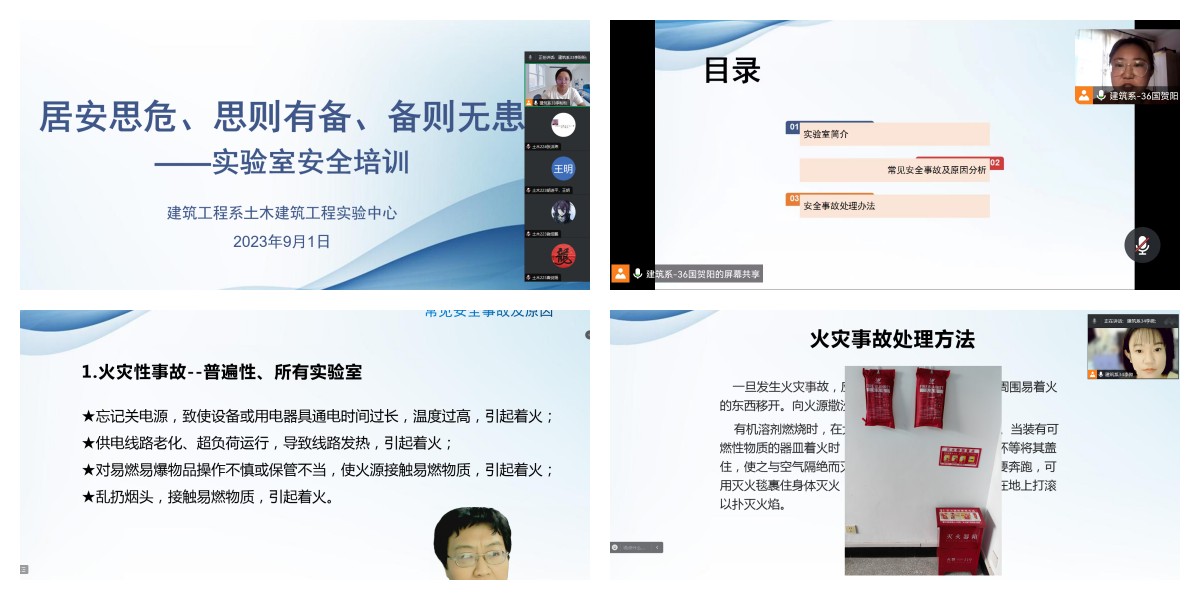 为确保实验室安全意识入脑入心,深入贯彻落实上级部署安排,扎实有效推进实验室安全管理工作。9月1日至2日建筑工程系土木建筑工程实验中心面对建筑工程系全体学生召开题为“居安思危、思则有备、备则无患”的线上实验室安全培训。实验中心主任李盼盼、实验技术人员李微、李智慧、国贺阳四位老师主持会议。