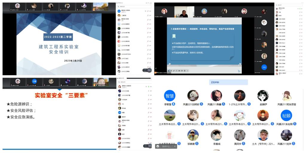 新学期即将到来,为保证同学们新学期在实验(训)室能安全顺利地开展实验、实训项目,建筑工程系-土木建筑工程实验中心于2月23、24日两天陆续开展新学期实验室安全培训工作,实验技术人员李盼盼、李智慧、李微、国贺阳组织全系学生进行实验室安全培训。培训采用腾讯会议的方式举行,本次培训利用近年来发生的实验室安全事故实例,强调了实验室安全的重要性,严守实验室安全红线,培养学生安全责任意识。重点讲解了实验室常见事故以及实验室事故处理办法。针对土木工程实验中心的实验室特点,有侧重的对学生进行安全培训,教育学生增强安全责任意识,提高安全防护与应急处置能力,使学生掌握进入实验(训)室的注意事项及安全操作规范。